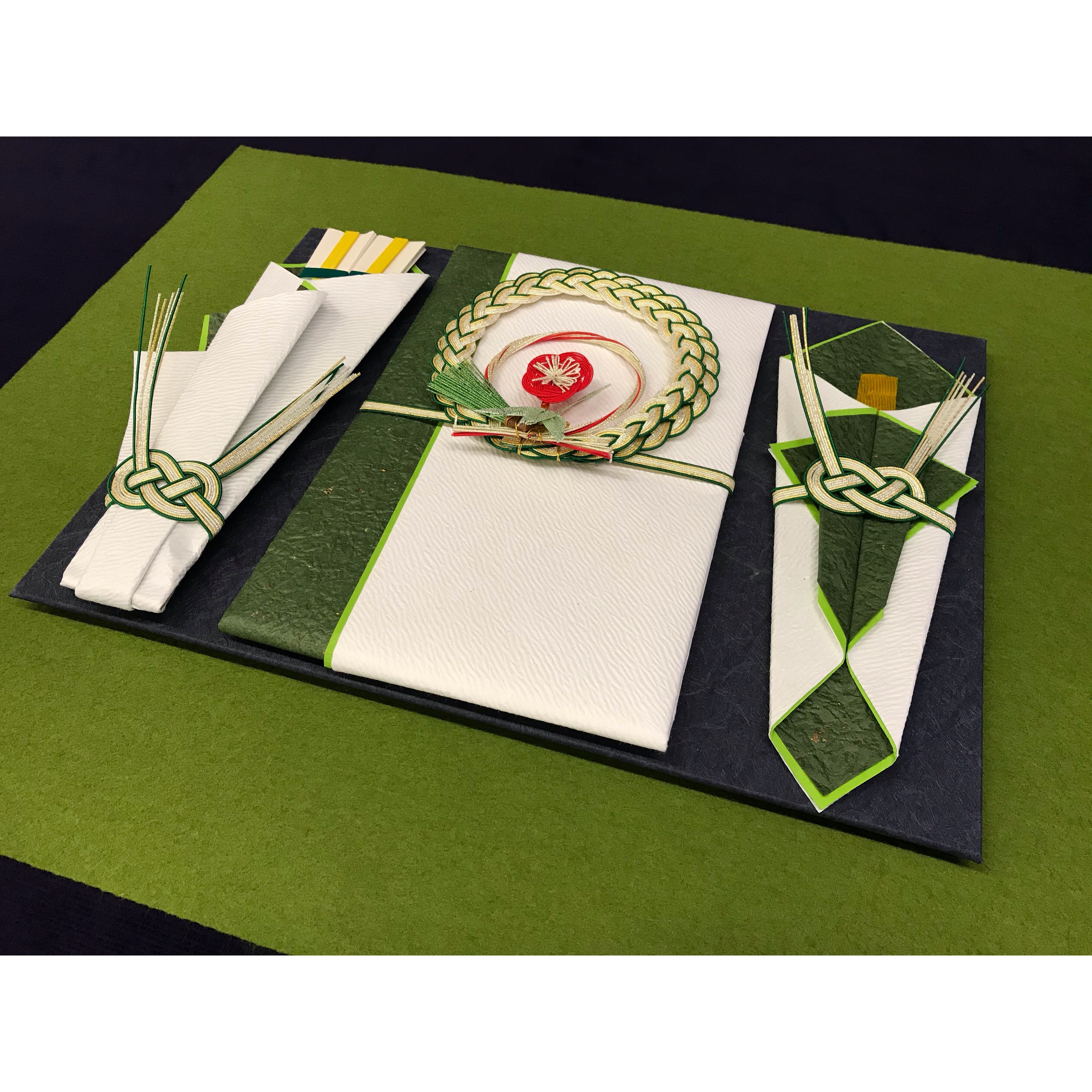 紙には手代檀紙、緑地に金振鳥の子和紙で仕上げ、紺色の丈夫な和紙風クロス貼りの飾台にし全体的なバランスをとった色合の三品飾りに仕上げました。